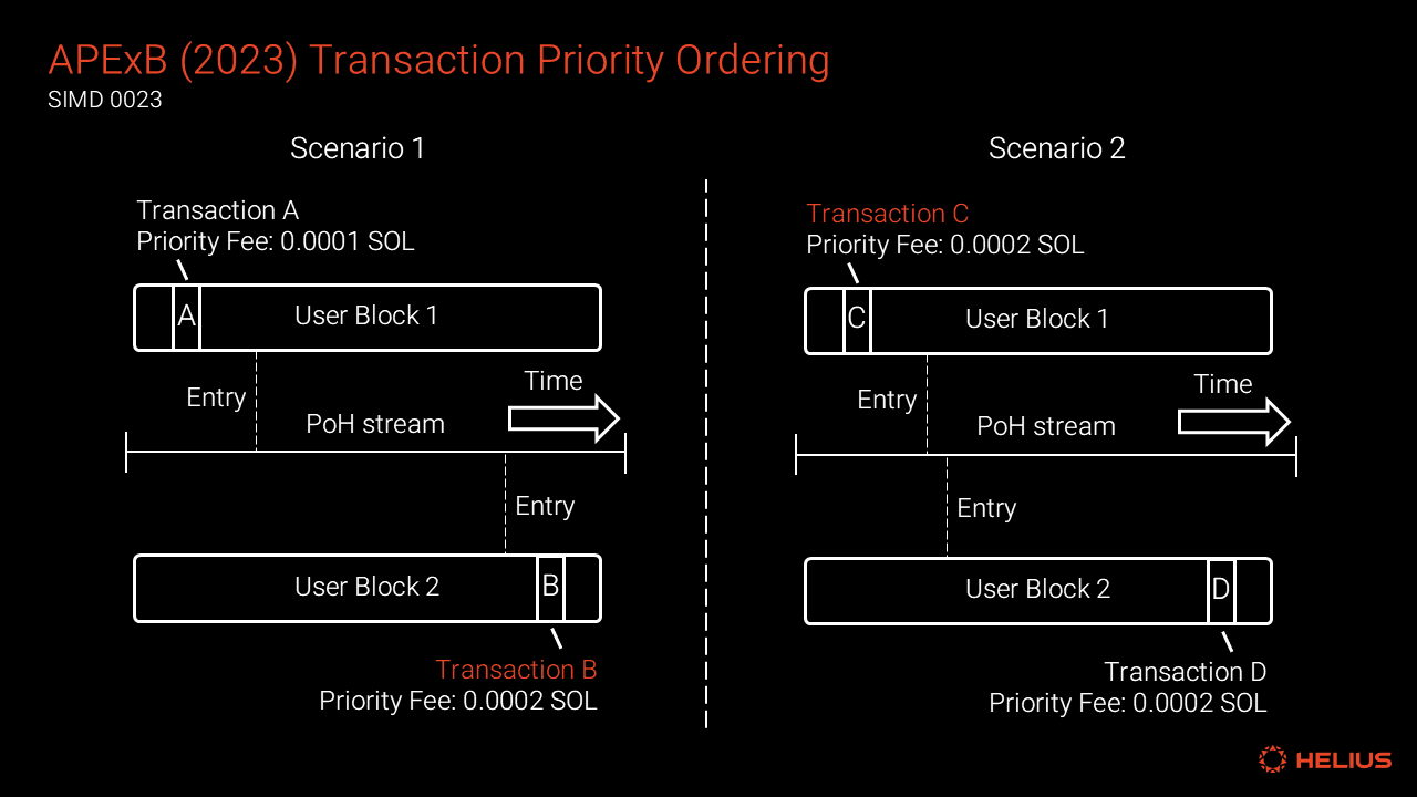 Above: In Scenario 1, Transaction B will be prioritized despite arriving later in the PoH stream. In Scenario 2, Transaction C will be prioritized as it holds the same priority fee as Transaction D, but its block is earlier in the PoH stream.